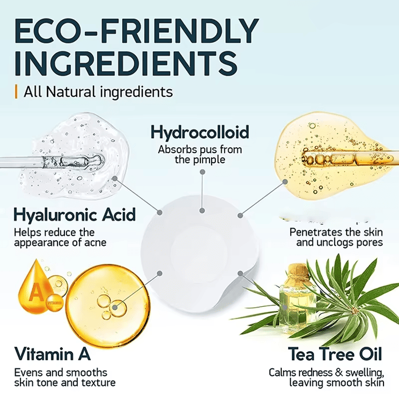 Our Tea Tree Oil Hydrocolloid Acne Patches are designed to absorb impurities, reduce redness, and protect blemishes while accelerating visible skin recovery.